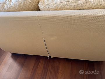 Rivestimento in tessuto giallo chiaro con motivo geometrico, struttura solida e imbottitura ancora in buone condizioni.