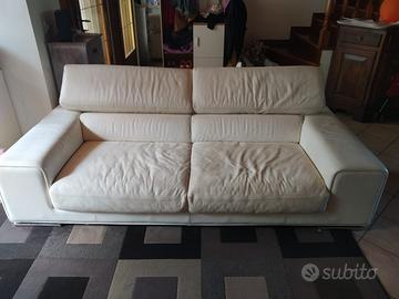 Divano usato bianco vera pelle, con poggiatesta pieghevoli. Qualche segno di usura, ma non rotto. Lunghezza 230cm profondità 105cm altezza 68cm
