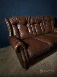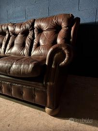 Divano in vero cuoio in stile Chester Chesterfield High back Rivestito in vero cuoio inglese, cuscini molto comodi con braccioli trapuntati in perfetta continuità con lo schienale, donano al divano una silhouette avvolgente e regale. La struttura è solida e comoda. Misure 1,99 90 99 cm di altezza