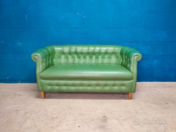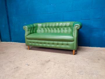 Proponiamo in vendita un raffinato divano Chester Chesterfield club 2 posti in vera pelle verde, dal design intramontabile e dalla forte personalità. Il modello presenta la classica lavorazione capitonné su schienale e frontale, braccioli arrotondati e piedini in legno massello.