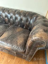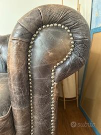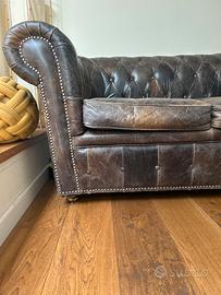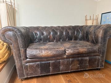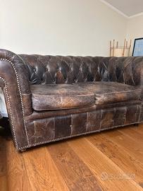 Vendo splendido divano modello Chesterfield a pozzetto, versione 2 posti, in vera pelle marrone scuro con finitura invecchiata naturale.Il divano è un classico intramontabile dell'arredamento, caratterizzato dalla tipica lavorazione capitonné sullo schienale e sui braccioli, rifinito con borchie metalliche applicate a mano. Materiale: Vera pelle pieno fiore con bellissima patina vintage (non ecopelle). Dimensioni indicative: Larghezza 170cm, Profondità 90cm, Altezza 75cm.