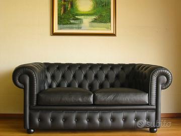 Divano Chesterfield 2 posti realizzato in vera pelle pieno fiore di colore nero, con seduta imbottita in piuma d'oca e roller con anima in gommapiuma per un comfort superiore e una resa estetica impeccabile.