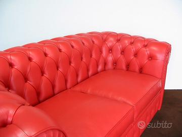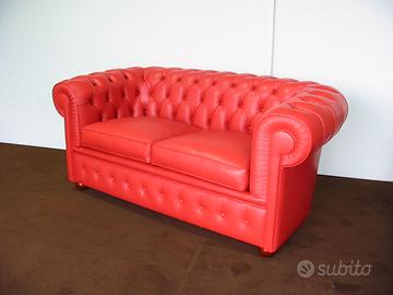 Divano Chesterfield 2 posti in vera pelle rossa, realizzato artigianalmente con la classica lavorazione capitonné anche sul fronte della seduta. Un modello compatto da 165 cm, perfetto per chi cerca stile e personalità anche in spazi più contenuti.