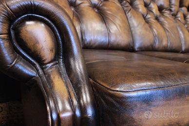 Divano Chesterfield bergere 3 posti in pelle marrone pastello, originale inglese