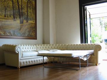 Divano chesterfield angolare in pelle color panna, con meccanismo letto estraibile integrato: l’unione perfetta tra eleganza classica e funzionalità. Il modello è lavorato con la tradizionale tecnica capitonné su schienale e braccioli, con bottoni rivestiti a mano. Sedute lisce e comode, piedini torniti in legno, e struttura solida in legno massello.