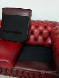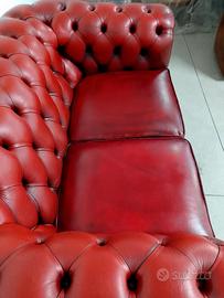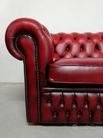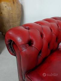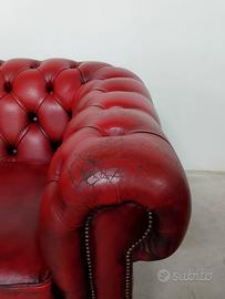 Divano 2 posti chesterfield modello club vintage inglese originale in pelle rosso bordeaux anticato dalle dimensioni contenute. Dimensioni totali : Lunghezza 153 Profondità 93 Altezza 73 cm Altezza seduta 44 cm. È stato effettuato un restauro conservativo con ripristino dell' imbottitura interna e l' aggiunta di strappi blocca cuscini. Il frontale classico è caratterizzato da un battitacco decorato da due file di bottoni e dai braccioli arricciati contornati dalle tipiche borchie in metallo battute a mano. Lo schienale è trapuntato da un preciso e un profondo capitonnè fissato nel fondo dai bottoni tirati a spago. Due cuscini bordati poggiano sulla seduta e sono bloccati da strappi. La superficie conserva la sua patina originale con i suoi affascinanti segni del tempo. Il costo è comprensivo di consegna effettuata personalmente da noi in alcune regioni dell Italia e di fattura esente da IVA secondo le normative vigenti. Per ulteriori informazioni e foto contattare Andrea Sale 3490506564.