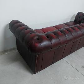 Divano chesterfield club originale inglese quattro posti in vera pelle rosso bordeaux anticata.