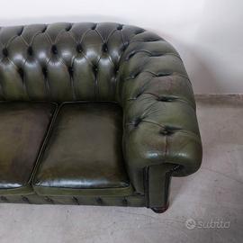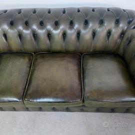 Divano chesterfield club originale inglese tre posti in vera pelle verde anticata.