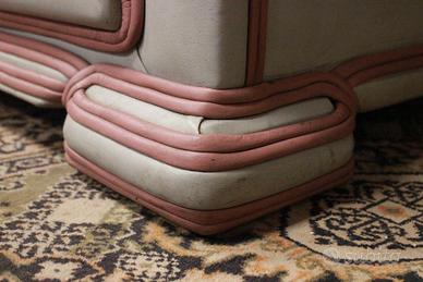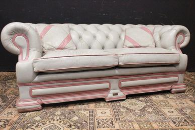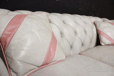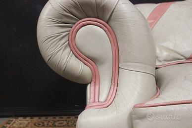 Divano Chesterfield modello Dellbrook club 3 posti in pelle bianco scuro con decorazioni rosa, originale inglese Chesterfield è un nome inglese che è garanzia di qualità. Il divano è degli anni ’70 circa (vintage), è un modello club (dallo schienale basso) Dellbrook in pelle bianco scuro e rosa. Al momento si trova nei nostri magazzini a Roncadelle (Brescia). Si tratta di un prodotto certificato Dellbrook, come dimostra la targhetta, la cui eleganza e particolarità risiedono nelle decorazioni rosa che percorrono l’intero divano, sottolineandone così la tradizionale lavorazione inglese che si mostra anche grazie all’imbottitura in stile capitonné dello schienale. Esso è un sofa comodo ed avvolgente, adatto ad arredare qualsiasi ambiente. Misure: Larghezza 185 cm – Profondità 90 cm – Altezza 70 cm. Per ulteriori informazioni contattateci ai seguenti numeri: Sig. Alessandro 340/1941515 Sig. Franco 333/6035965
