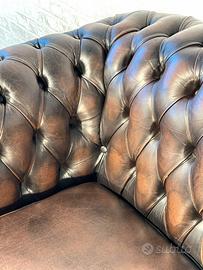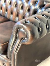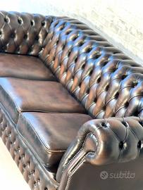 Splendido divano Chesterfield a 3 posti in vera pelle marrone, stile classico inglese, perfetto per arredamenti eleganti, pub, locali, studi professionali o abitazioni.