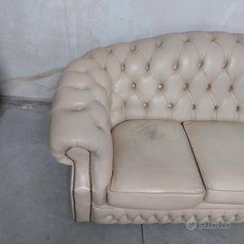 Divano chesterfield Oxford vintage originale inglese tre posti in vera pelle bianco panna.