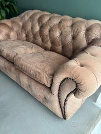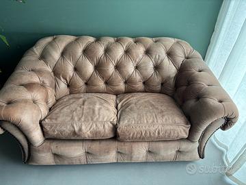 Divano Chesterfield 2 posti in pelle marrone chiaro, dall’eleganza senza tempo. Realizzato in vera pelle originale, presenta la classica lavorazione capitonné su schienale e braccioli, con una struttura robusta e dettagli rifiniti a mano. Perfetto per ambienti raffinati, unisce comfort e stile in un design iconico.