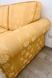 Divano a due posti in stile classico, rivestito in tessuto jacquard color giallo/oro con motivo floreale e profili rifiniti a cordoncino. Struttura solida e imbottitura confortevole, seduta ampia con due cuscini schienale integrati. Ideale per salotto, studio o ambiente elegante. Design senza tempo, adatto anche ad arredamenti classici o vintage.