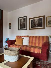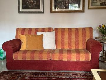 Divano classico, Tre posti ocra e rosso avente i suoi anni, ma tenuto pulito e con cura
