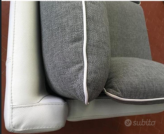 Divano lunghezza cm 160, realizzato in italia da azienda artigianale. Struttura in pelle color ghiaccio. Cuscinatura in tessuto grigio sfoderabile. Mai utilizzato, tenuto in esposizione.
