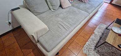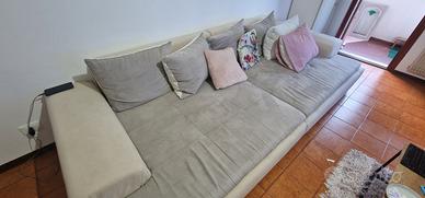 vendo per cambio arredamento divano completamente rifoderato . struttura perfetta ( necessità solamente di essere pulito ) . i 4 cuscini inclusi non sono stati foderati ( parte posteriore di ecopelle che si sgretola). bicolore beige e grigio perla. misure 300x 150 si divide in due blocchi con ganci per bloccarsi tra loro . si trova al 2 piano con ascensore ma non siamo sicuri che ci entra