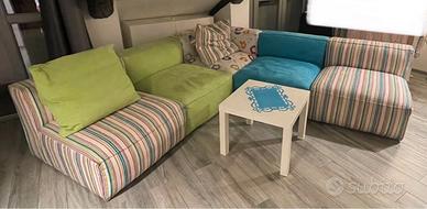 Divano componibile composto da 5 poltrone indipendenti, tutte in ottimo stato, rivestimento in tessuto sfoderabile colorato a righe/tinta unita. Le sedute misurano ciascuna cm.80 di larghezza e cm. 92 di profondità e possono essere disposte in modo da creare più composizioni differenti
