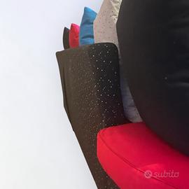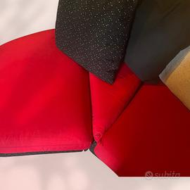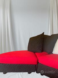 Divano componibile completamente sfoderabile completo di pouff. Scocca nera a pois colorati, seduta rossa, cuscini ( in piuma) x schienali nei diversi colori abbinati alla armocromia del divano.