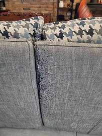 Una cerniera che sostiene un cuscino è danneggiata e la stoffa presenta graffi e un buco sulla seduta.