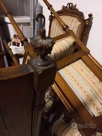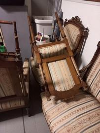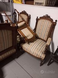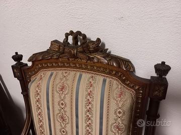 Salotto composto da divano, 2 poltrone e 4 sedie. In buono stato di conservazione. La stoffa è in perfette condizioni. Solo una gamba del divano necessita di restauro. Lo stile si rifà a un Luigi XVI ma è un salotto risalente al XIX secolo.