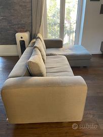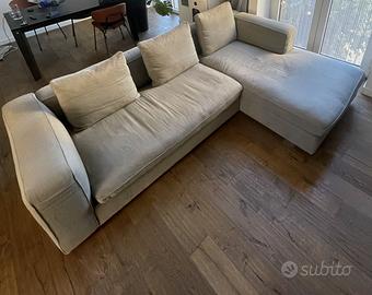 Sia la struttura che i cuscini sono in tessuto lino, misto cotone completamente sfoderabili e lavabili. In ottime condizioni, vendo perchè troppo sovra dimensionato per il soggiorno. Il divano si "scompone" sganciando la chaise longue dal corpo centrale a due posti.