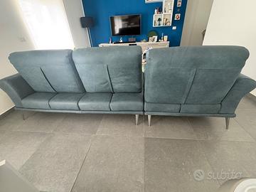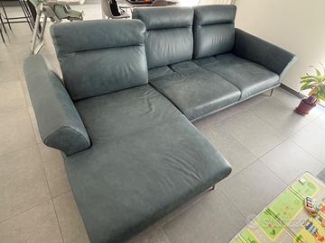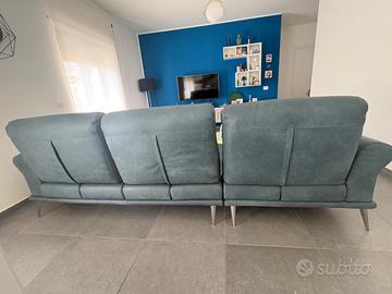 Divano color petrolio in pelle con 3 meccanismi traslatore che aggiungono fino a 23cm di profondità di seduta. 2 posti Max 1 bracciale + 1 Chaise-longue Max 1 bracciale cm 295 x 165/174. DISPONIBILE DA INIZIO MAGGIO!