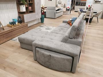 La particolarità è la presenza di2 pouf a scomparsa, che possono essere posti negli appositi vani creati nella parte inferiore dei due braccioli a destra e a sinistra, per mantenere la stanza ordinata ed utilizzarli solo all’occorrenza.