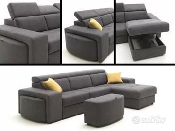 Versatile ed elegante per il soggiorno. Questo pratico sofà, dotato dipoggiatesta reclinabili, nasconde una comodapanchetta letto estraibile. È dotato inoltre di una confortevolechaise longue reversibile con box contenitore. È possibile scegliere se avere la chaise longue a destra o a sinistra.