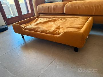 Bellissimo divano tre posti con chaise longue e poltrona relax color curcuma con cuccia per animali domestici in tessuto antimacchia e pelo