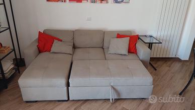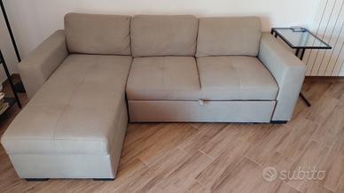 Vendo divano in ottime condizioni con nr 2 cuscini in tinta inclusi. Chaise Longue con contenitore. Piccolo difetto su una cucitura come da foto. Ritiro a mano. Dimensioni: 230 cm x 84 cm (Chaise Longue 150 cm).