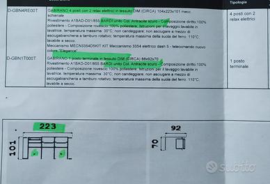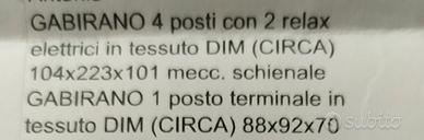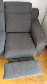 Divano in tessuto 4 posti con 2 postazioni reclinabili elettrici telecomandati individualmente + un posto x seduta non fissa come chaise loungue colore antracite. Appoggiatesta indipendenti e regolabili manualmente. Cm. 223x104x101 divano, + seduta cm. 88x92x70.Ottimo stato completamente sfoderabile e lavabile in lavatrice.