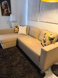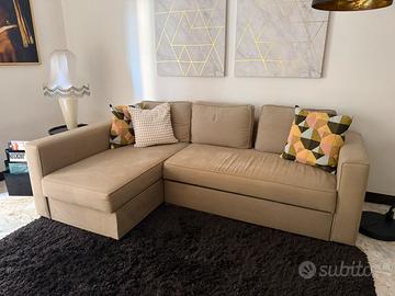 Divano 4 posti con chaiselonge modello manstad ikea,con cassettone contenitore sotto la chaise longue e poggiapiedi estraibile che lo rende un divano letto ad 1 piazza e mezza. Colore sabbia. Misure larghezza 240 altezza 73 profondità 1,55 Prezzo 250 lievemente trattabile