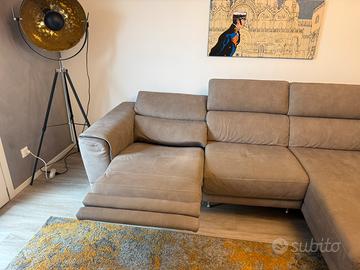 Divano modello Lieto in tessuto antimacchia ,lavabile. Dotato di recliner elettrico e chaisse longue. Ogni poggiatesta è regolabile micrometricamente. Dimensioni: totali L 263 x P 105 cm seduta 53 cm. chaisse longue L 90 x P 160 cm seduta 120 cm