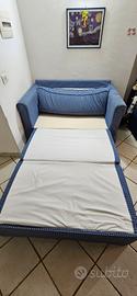 DIVANO LETTO 2 posti, letto da 1 piazza e mezzo, Ikea Hagalund, letto estraibile e cassetto contenitore. Colore blu con righe bianche. Rivestimento lavabile. Supporto in pino massiccio. Doghe in faggio. L 150 x H 91 x P 86 . Letto 120 cm. Lunghezza letto estratto 196 cm. Tenuto in ottime condizioni.