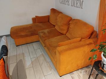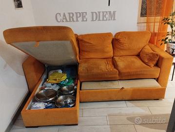 Regalo bellissimo divano letto arancio acido con chaise longue ed enorme contenitore. Il divano è ancora in buone condizioni, in caso di necessità si può trasformare in comodo letto per due persone semplicemente tirando il cassettone (nuovissimo in quanto usato appena due volte); unico difetto vero è la seduta centrale un po' ceduta come si può evincere dall'ultima foto. In seconda battuta aggiungo il colore leggermente sbiadito in qualche punto, per il resto è ancora un divano efficente e di una comodità non facilmente trovabile in quelli moderni. Le misure sono 225 (lato sedute) X160 (lato penisola) X70 (altezza).