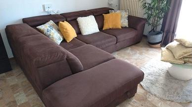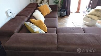 Divano 5 posti marca Poltronesofà angolare con 5 poggiatesta reclinabili,penisola con cassettone sottostante molto capiente,lettino scorrevole a scomparsa completamente sfoderabile e lavabile in lavatrice stoffa tipo Alcantara antimacchia, antigraffio, idrorepellente,struttura molto robusta,allego foto più schizzo con misure.