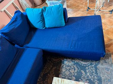 Vendo divano con penisola in ottime condizioni e molto comodo. Colore blu con cuscini in contrasto azzurri.