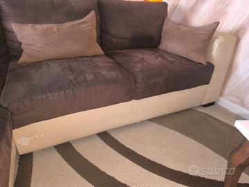 divano con penisola un po' rovinato nella parte dove c'è l' ecopelle. tavolino in legno senza segni di usura disponibile per il ritiro da metà maggio