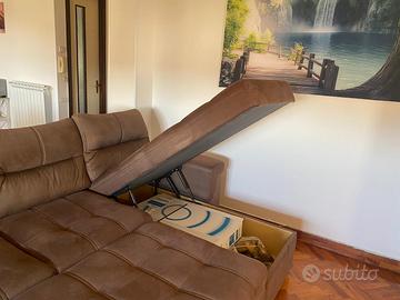 Vendo elegante divano angolare in tessuto effetto alcantara di colore marrone/tortora come nuovo, comodo e moderno, perfetto per soggiorni open space.