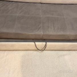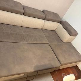 Divano con penisola e poggia piedi allungabile. La penisola é contenitore sotto. Cuscini pieghevoli.