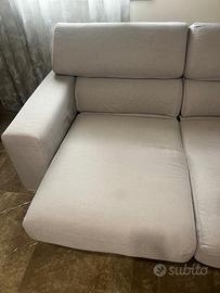 Vendo divano grigio in tessuto interamente sfoderabile, a tre posti con penisola. 2 postazioni con seduta estraibile in maniera molto pratica con sistema di trascinamento a mano. Piedini in metallo argento, lunghezza del divano 2,80metri