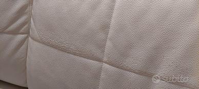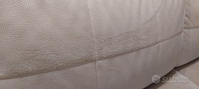 Divano in vera pelle con penisola. Il divano è largo 3 metri, la penisola è profonda 120 cm. La struttura è ottima ma la pelle di 2 sedili e 2 schienali si screpola come da foto. Cuscini e schienali sono completamente sfoderabili.