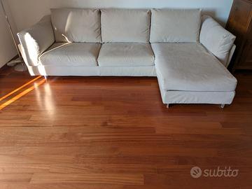 Divano Zeno della Biba Arredamenti con penisola spostabile a destra o sinistra, struttura in legno di pioppo, piedi in lamina satinati, cuscini di seduta sagomati per evitare che scivolino in avanti in poliuretano espanso 80x80 cm. Cuscini schienale e braccioli in piuma naturale lavorata a camere separate per impedire lo svuotamento con inserto in poliuretano espanso per aiutare a sostenere la piuma. Tessuto antimacchia color canapa interamente sfoderabile, scocca compresa.