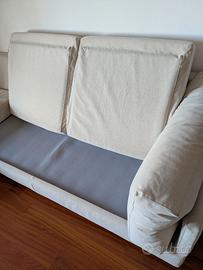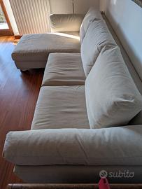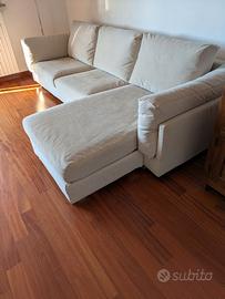 Divano Zeno della Biba Arredamenti con penisola spostabile a destra o sinistra, struttura in legno di pioppo, piedi in lamina satinati, cuscini di seduta sagomati per evitare lo scivolamento in avanti in poliuretano espanso 80x80 cm. Cuscini schienale e braccioli in piuma naturale lavorata a camere separate per impedire lo svuotamento con inserto in poliuretano espanso per aiutare a sostenere la piuma. Tessuto antimacchia color canapa interamente sfoderabile, scocca compresa.