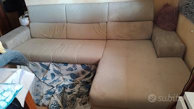 Divano 5 posti con penisola contenitore si apre a divano letto ma non con materasso. Un po vissuto ma in buone condizioni con poggiatesta regolabili