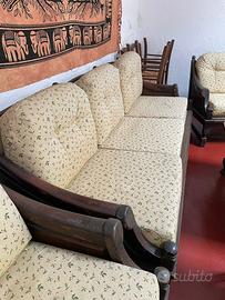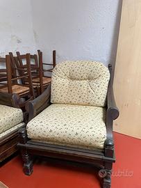 Divano con 2 poltrone in legno e tessuto e tavolino in legno Prezzo tutto: 300€ Ritiro a mano - no spedizione
