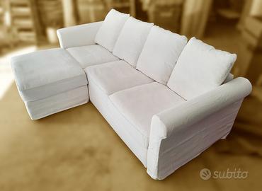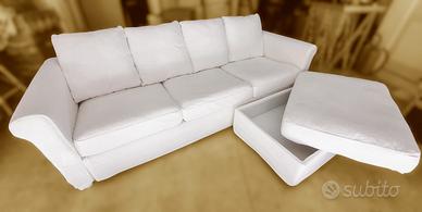 Elegante divano angolare in tessuto bianco panna, perfetto per arredare con stile e praticità il tuo salotto. Il rivestimento è completamente sfoderabile, facilitando la pulizia e il mantenimento nel tempo.
