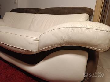 Divano due posti(seduta large) della Aerre Italia, modelli mikonos, in pelle e tessuto. misure 2,30 x 1, 00, comprensivo di pouf 80x 60 e 2 cuscini 40x40 uno di pelle bianca e l'altro di tessuto marrone, sfoderabili. Ottime condizioni. nessun taglio. nessuna rottura o scucitura