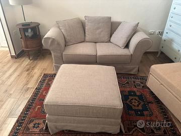 Vendo divano comodo con cuscini ben tenuto e pouf poggiapiedi utilizzabile come complemento d’arredo o appoggio, ideale per soggiorno o studio.