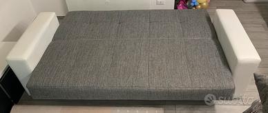 Vendo divano di 230 cm di lunghezza di colore grigio antracite e braccioli bianchi in ecopelle. Questi ultimi sono abbastanza larghi da appoggiare tranquillamente le braccia.